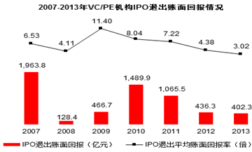 2014年共有143筆創(chuàng)投IPO退出案例。其中,賬面收益率超過(guò)10倍的只有10筆,僅占總數(shù)的7%左右;24筆創(chuàng)投退出時(shí),賬面收益能達(dá)到3%-10%;剩下逾七成的退出案例,收益率低于3%。按照新股發(fā)行價(jià)計(jì)算,平均賬面回報(bào)率2.77倍。