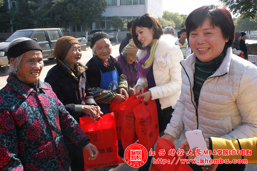 據(jù)悉,此次于都光明敬老院孤寡老人愛心捐獻(xiàn)活動(dòng)是我校EMBA贛州總裁八班繼2012年9月17日興國楊村小學(xué)貧困學(xué)子愛心捐獻(xiàn)和2013年1月7日贛縣特殊學(xué)校聾啞兒童愛心捐獻(xiàn)活動(dòng)后舉辦的第三次愛心捐獻(xiàn)活動(dòng),也是班級(jí)畢業(yè)后的首次愛心捐獻(xiàn)活動(dòng)。我校EMBA贛州總裁八班副班長(zhǎng)、贛州市博達(dá)醫(yī)療器械有限公司總經(jīng)理涂靜和我校EMBA贛州總裁八班體育委員、“八班之家”聯(lián)絡(luò)人、貴州古鎮(zhèn)酒業(yè)江西分公司總經(jīng)理李世榮紛紛表示,尊老敬老、扶貧幫困是中華民族的傳統(tǒng)美德,多做慈善事業(yè)也是企業(yè)家感恩社會(huì)、履行社會(huì)責(zé)任的具體表現(xiàn),即便畢業(yè)了,班級(jí)將依舊一如既往的將這種慈善愛心活動(dòng)進(jìn)行下去,爭(zhēng)取每年至少捐獻(xiàn)一次愛心,將企業(yè)家的溫暖送給最需要關(guān)懷的人。(圖文/MBA學(xué)院EDP中心宣傳部 鄒龍江)