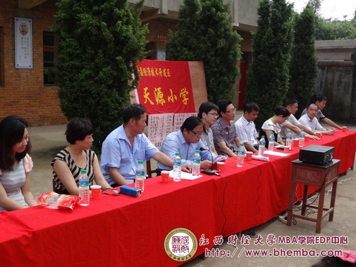南昌經濟開發(fā)區(qū)天源小學,這里已是市郊,地形是典型的南方低地丘陵,并不平坦,但也不遠是山水環(huán)繞,鄉(xiāng)村周圍路勁多是煤渣路,也修有不寬的水泥路。這里村莊多是舊山字屋、兩三層的舊樓房,確實不算富裕,尚待開發(fā)。天源小學就坐落在村莊附近的一片小土坡旁邊。來到天源小學,門口有十名小學女學生,站立兩旁,揮旗歡迎。進入校門口,王殿華同學見小女生們,在太陽底下站立歡飲,很是辛苦,就要她們撤掉,回校園樹蔭底下休息去。王殿華同學對小女生們的細微關懷,在場學校老師和其他總裁學員都無不為此小細節(jié)而深深打動。