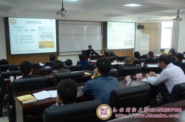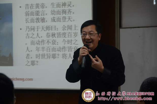 在財大青山園EMBA教室中傳來一片朗朗的誦讀聲:“昔在黃帝,生而神靈,弱而能言,幼而徇齊,長而敦敏,成而登天。乃問于天師曰:余聞上古之人,春秋皆度百歲,而動作不衰;今時之人,年半百而動作皆衰者,時世異耶?將人失之耶?……”。4月21~22日由著名國學(xué)專家,養(yǎng)生專家,書法家,國學(xué)修心倡導(dǎo)者,國學(xué)修心第一人——張其成老師給財大國學(xué)班的同學(xué)們主講《黃帝內(nèi)經(jīng)》。