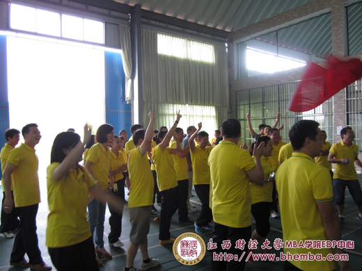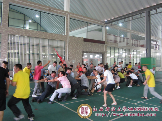 下午五時許,在結(jié)束完南開大學孫非教授《組織行為學》和上海海事大學潘國陵教授《資本運作》課程后,總裁學員們便迅速的集結(jié)在一起,大家你一言我一語的為即將舉行的拔河比賽獻言獻策,并在班委的組織下迅速挑選出了14名男同學、6名女同學共計20人的拔河隊伍。在經(jīng)過簡短的訓練后,五點三十分,陽光明媚的五龍客家風情園,一聲哨音打破了寂靜,“加油!加油!”聲此起彼伏。賽場上,兩班拔河隊員們展開了激烈的爭奪,對壘雙方互不相讓,充當先鋒的男生們個個面紅耳赤,全力以赴,女生也是巾幗不讓須眉,當仁不讓;賽場下,兩班啦啦隊沸騰了,手舞足蹈,喊聲激昂,全力以赴的為班級爭得榮譽。