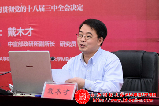 “十八屆三中全會是一次具有標志性、綱領(lǐng)性、轉(zhuǎn)折性意義的會議?!闭搲_始,戴木才研究員以這句話確定了十八屆三中全會的重大戰(zhàn)略意義。隨后,戴研究員進一步介紹了全面深化改革的重大戰(zhàn)略意義,并就全面深化改革是否是“經(jīng)熱政冷”的問題作了解疑。他說,對于政治體制改革應(yīng)該要有三點重要認識:不能站在西方政治視角或以西方政治標準衡量我國政治體制改革;未突出表述并不意味著放棄政治體制改革,或不進行政治體制改革;綜合性改革與相關(guān)改革,都在為政治體制改革奠基,或者為政治體制改革留出足夠空間,是更廣泛意義上的政治體制改革。隨后,他就學員感興趣的我國經(jīng)濟政治發(fā)展走向以及經(jīng)濟體制改革和國有企業(yè)改革相關(guān)問題進行了講解,并就全面深化改革向大會舉了若干政治實踐,深刻解讀了黨的十八屆三中全會精神。