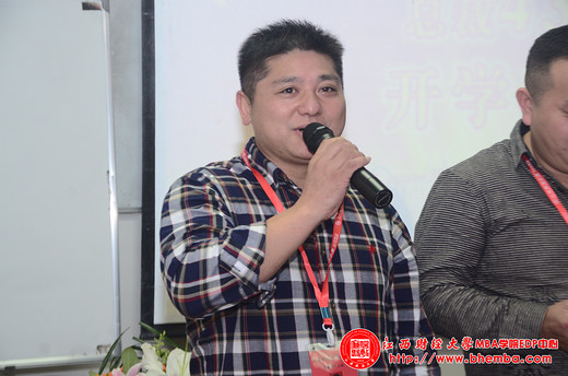 總裁十九班班長(zhǎng)、江西省鴻海通信規(guī)劃設(shè)計(jì)有限公司的耿建軍同學(xué)作為老學(xué)員代表發(fā)言,他侃侃而談,通在財(cái)大總裁班的學(xué)習(xí)感悟深刻,首先,是觀念,性格決定命運(yùn),并再次肯定了財(cái)大總裁班名師授課的效應(yīng),他本人在學(xué)習(xí)中受益匪淺,頗有心得。其次,是收獲了友誼,每一位同學(xué)都有人格閃光點(diǎn),接著,是開(kāi)闊了視野,拓展人脈。最后他以一位學(xué)長(zhǎng)的身份建議選一位好的班委是整個(gè)班級(jí)的凝聚力、向心力的基礎(chǔ)條件之一。