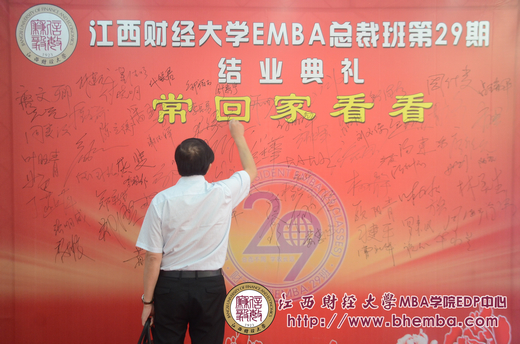 2012年7月22日,這是一個與眾不同的日子,也是一個值得慶祝的日子,今天的總裁29班在歷經(jīng)一年的學(xué)習(xí)完成了他們的學(xué)業(yè),從而舉行隆重的畢業(yè)典禮。早上九點時分,踏上鮮紅的地毯,走進EMBA學(xué)院的三樓,我們看到的是總裁29班的全體照片,每個學(xué)員的臉上都有著初入學(xué)堂的激動與對未來的期望與展望,因為這是他們?nèi)雽W(xué)的見證。29班同學(xué)們陸續(xù)來齊,教室外置有畢業(yè)主題的大紅底色簽名板,同學(xué)們紛紛留下了自己的親筆簽名,我們看到的是每個學(xué)員龍飛鳳舞、剛勁有力的簽名,這是你們畢業(yè)的見證,也是你們留給我們的記憶,我們會好好的惠存。