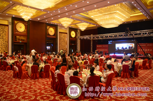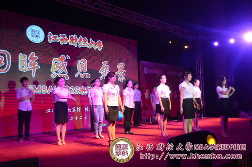 7點時分,總裁29班耗時兩個月之久精心準備的節(jié)目開始上演,開場鼓舞《鼓舞飛揚》,用激昂的腔調(diào)以及優(yōu)美舞姿點燃了酒會的引線。主持人穿梭在舞臺上,用詼諧幽默的語言,博得在場觀眾的陣陣的掌聲與歡笑。期間學員代表歐陽意獅用一首《等不到的愛》博得了在場學員以及嘉賓最高的歡呼以及喝彩,也把晚會推向了一個小高潮。MBA學院EDP中心的全體老師也為總裁29班的學員們送上了最真心的祝福,手語舞《相親相愛一家人》,得到了在場學員的熱烈響應,全場的學員都站了起來,跟著老師一起做起了手語舞,而且在節(jié)目表演完畢后,全體學員強烈要求重溫上課的程序。上課,起立,老師好,同學們好,多么簡單平實的話,但是在這樣的晚會說出來,顯的是那樣的溫馨與溫暖。晚會別出心裁,穿插了許多學員家屬的節(jié)目表演,如跆拳道表演等,還有抽獎輪番的互動活動,時時引來獲獎者的驚喜,以及臺下躍躍欲試的感慨。晚會的節(jié)目異彩紛呈,歌曲、異域風情的舞蹈、雜技、小品、相聲,應有盡有,讓人應接不暇,也從中感受到了總裁29班對于這場友誼盛典的重視與不舍。