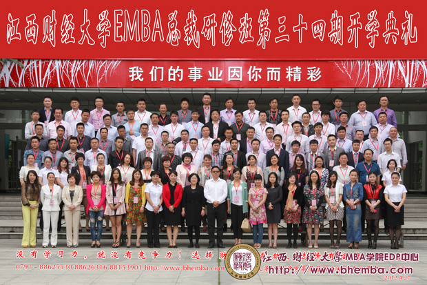 江西財(cái)經(jīng)大學(xué)EMBA總裁研修34班,是2012年第一期,經(jīng)過(guò)近三個(gè)月的招生準(zhǔn)備工作,到4月中旬,班級(jí)學(xué)員名額規(guī)模已逾百數(shù),學(xué)員身份都是在江西省經(jīng)營(yíng)工作的企事業(yè)單位的中高層管理者,地區(qū)來(lái)自江西全省十一個(gè)地區(qū)二十多個(gè)縣級(jí)市,行業(yè)覆蓋建筑、金融、鋼鐵、物業(yè)、服務(wù)和文化等多個(gè)領(lǐng)域,學(xué)員們有著豐富的企事業(yè)經(jīng)營(yíng)管理經(jīng)驗(yàn),歷經(jīng)了成功的喜悅,也積累了人生的財(cái)富,財(cái)大總裁班學(xué)員不愧為財(cái)富、身份、實(shí)力和成功的象征。而這樣一群成功的人聚集在一起,重返校園,重拾書(shū)本,集體充電提升,以期更大的業(yè)績(jī)回報(bào),這又是一大值得推崇的盛舉,必將對(duì)自身企業(yè)、對(duì)江西的經(jīng)濟(jì)都將會(huì)產(chǎn)生不可估量的市場(chǎng)價(jià)值和推動(dòng)作用。