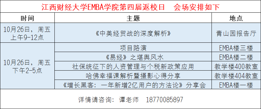 10月26日,由江西財(cái)經(jīng)大學(xué)工商管理學(xué)院、江西財(cái)經(jīng)大學(xué)EMBA學(xué)院主辦,江西財(cái)經(jīng)大學(xué)EMBA學(xué)院EDP中心、博海國濟(jì)商學(xué)院承辦的2018年第四屆“薪相傳·同致遠(yuǎn)”返校周慶典將同步開展!