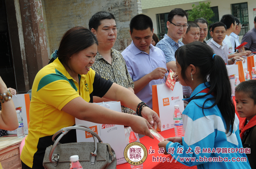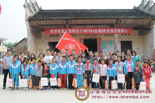 捐獻(xiàn)愛心,履行社會責(zé)任,為祖國的未來奉獻(xiàn)一份炙熱的關(guān)愛!2012年9月17日上午,江西財經(jīng)大學(xué)EMBA贛州總裁八班學(xué)員在班主任李老師和班委成員的帶領(lǐng)下,從贛州市出發(fā),驅(qū)車一個多小時,來到革命老區(qū)、將軍縣———興國縣,為興國楊村小學(xué)的20名一、二年級的貧困學(xué)生們奉獻(xiàn)真情,捐獻(xiàn)愛心。